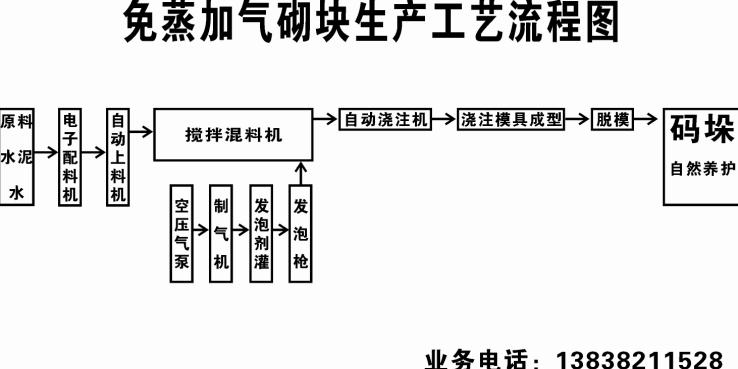 3、工藝簡單,易操作。采用制氣劑及增強劑將水泥、粉煤灰、砂等材料聚合,通過物理加氣,利用專用設(shè)備及模具成型即可,無須蒸壓養(yǎng)護。